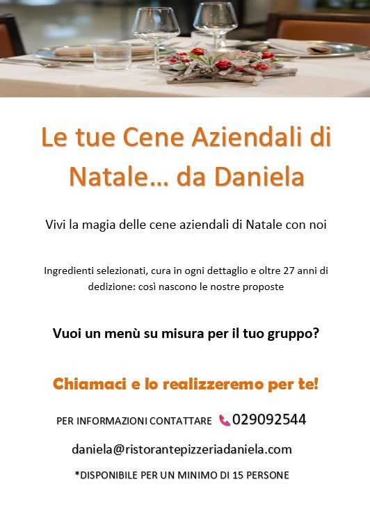 Il Ristorante Pizzeria Daniela si presta per qualsiasi evento: che si tratti di una cena di lavoro, di un compleanno, di una festa di laurea o del giorno del proprio matrimonio. All’interno, si compone di due grandi sale che ospitano più di 120 coperti e nella bella stagione mette a disposizione un delizioso déhor che si affaccia sulla piazza centrale di Trezzo, a pochi passi dal castello Visconteo.